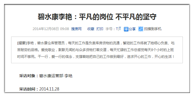 李艷,碧水康倉庫管理員,每天的工作是負(fù)責(zé)庫房貨物的流通,繁瑣的工作練就了她細(xì)心負(fù)責(zé)、吃苦耐勞的品格。愛崗敬業(yè),默默無聞的與眾多貨物打著交道,每天忙碌的工作總感覺每天8個小時的上班時間不夠用。干一行,愛一行的信念,支撐著她把自己的工作做到*好,追求開心的工作,開心的生活!