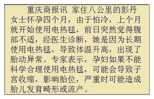 標(biāo)題:重慶一孕婦使用電熱取暖設(shè)備,導(dǎo)致胎動異常!