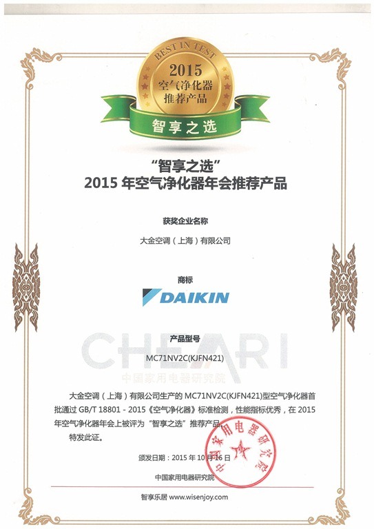 10月16日,由中國家用電器研究院主辦的主題為“打造凈逸空間 創(chuàng)造健康生活”的2015年空氣凈化器年會暨首批通過新國標測試產品發(fā)布會于北京盛大召開。大金MC71NV2C系列空氣凈化器等八個品牌九個型號的空氣凈化器產品首批通過了空氣凈化器新國標GB/T18801-2015測試,并在新國標考察的CADR、CCM、噪聲的三個主要性能指標上表現(xiàn)優(yōu)異,被評為“智享之選”推薦產品。