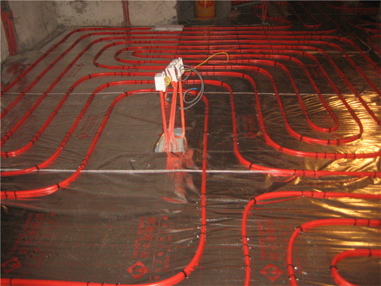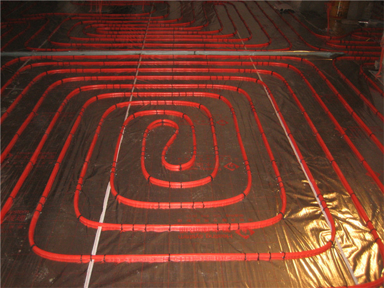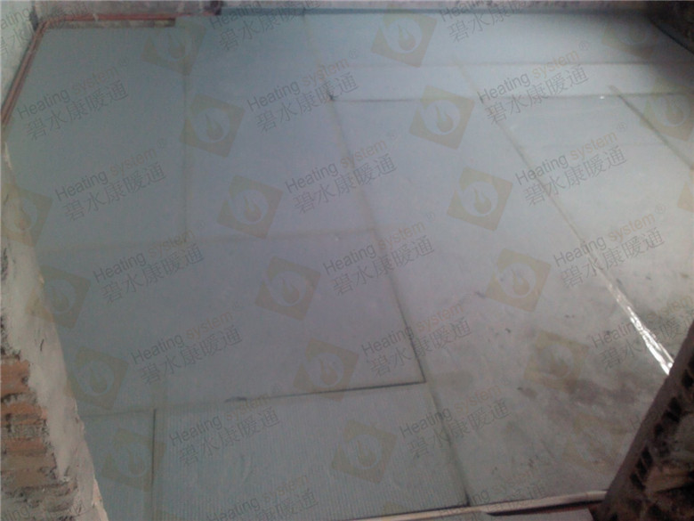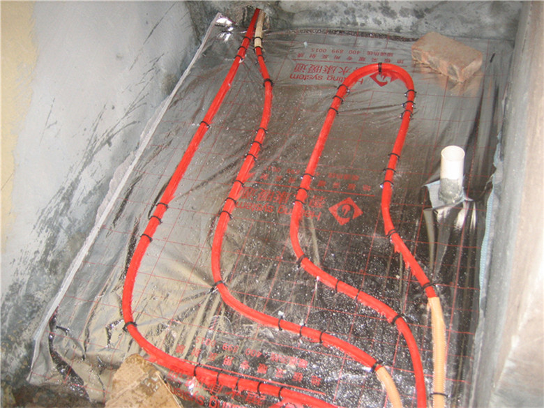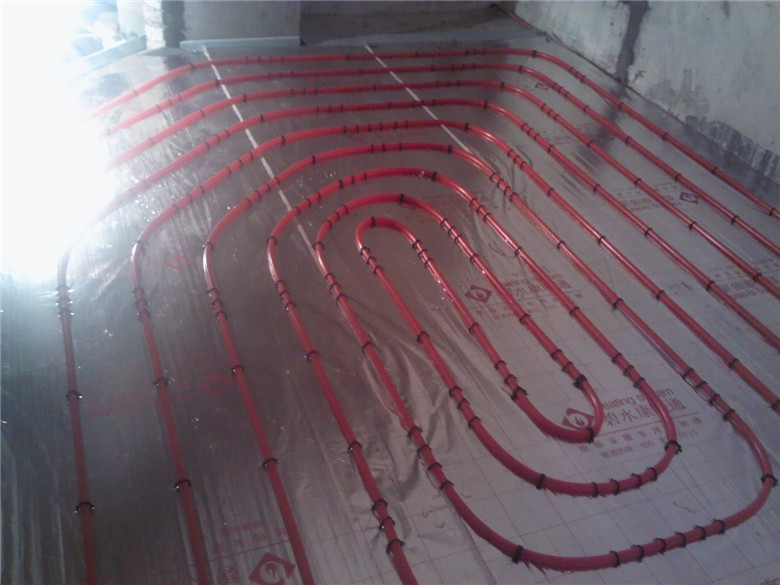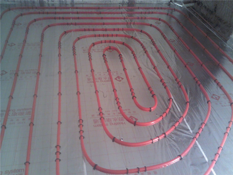 3.鋪設反射膜后,再鋪設PE-RTⅡ代地暖專用管,用專用卡釘固定盤繞(雙管螺旋鋪設,平整,彎曲無變形);
