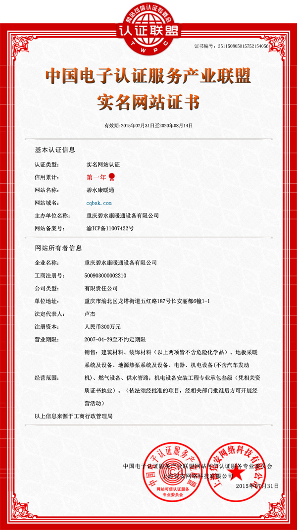 7月31日,碧水康暖通公司網(wǎng)站成功通過了中國電子認(rèn)證網(wǎng)站可信認(rèn)證服務(wù)專業(yè)委員會(huì)的實(shí)名認(rèn)證。
