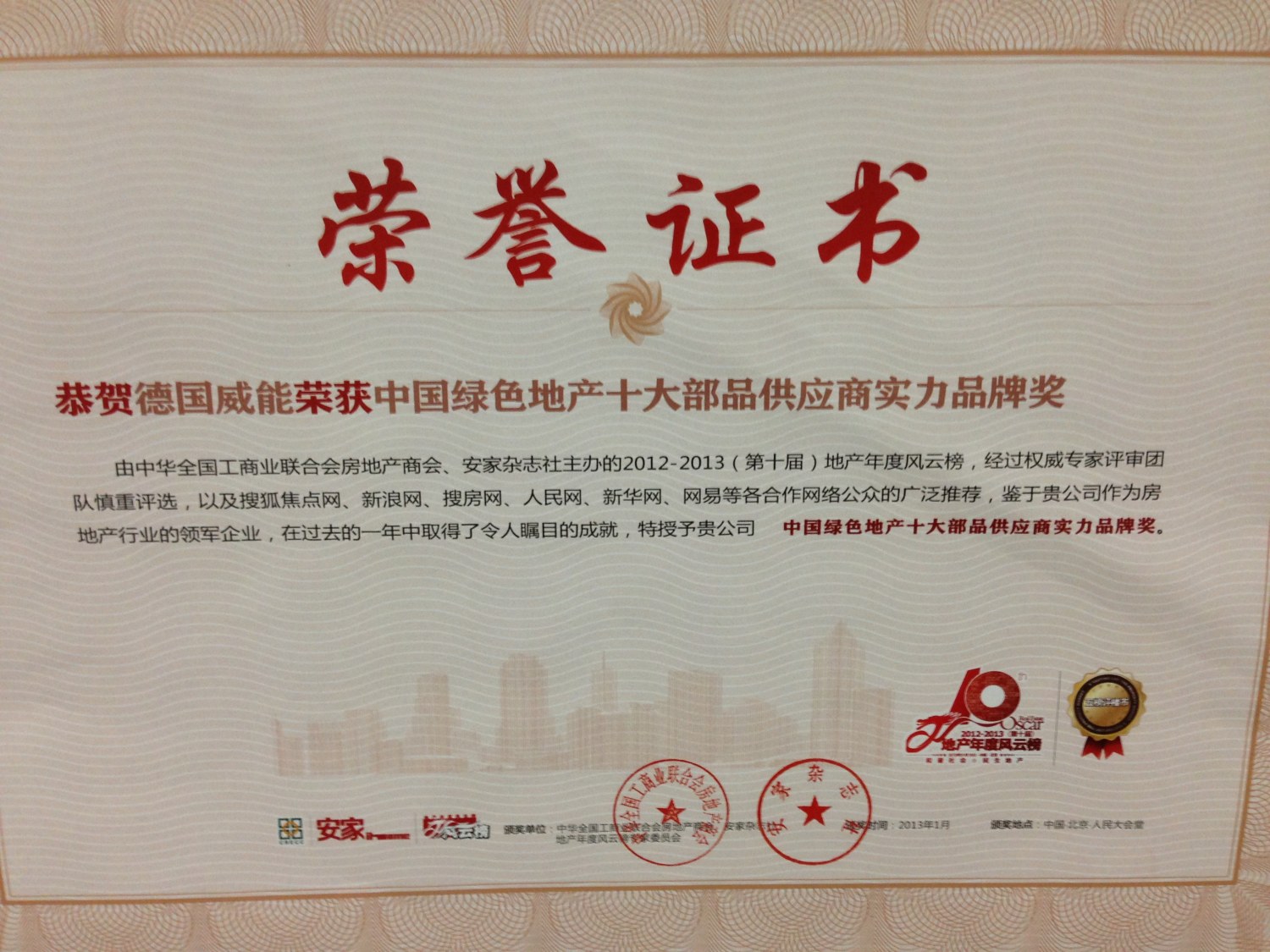 2013年1月18日,在全國工商聯(lián)房地產(chǎn)商會及《安家》雜志社聯(lián)合主辦的“第十屆地產(chǎn)年度風云榜”頒獎典禮上,德國威能喜獲“中國綠色地產(chǎn)十大實力品牌供應商”大獎,成為閃耀全場的明星企業(yè)之一。