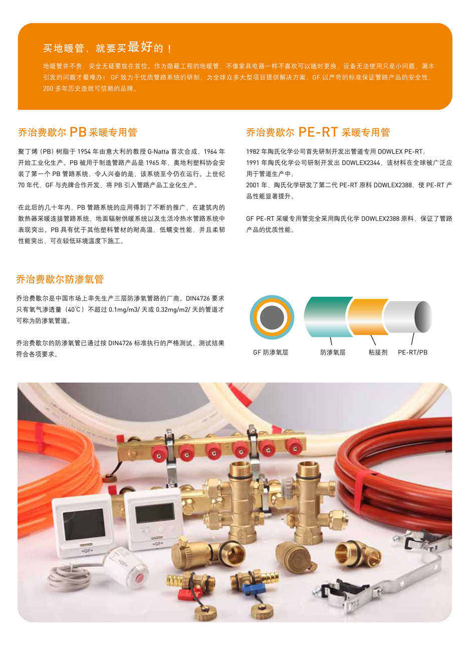 采暖管路控制系統(tǒng)是瑞士喬治費(fèi)歇爾(+GF+)品牌,創(chuàng)立于1802年,有塑料開始就有喬治費(fèi)歇爾的管道,以其著名的工業(yè)產(chǎn)品和良好的服務(wù)享譽(yù)全球,管道材質(zhì)是PE-RTⅡ代,全套系統(tǒng)高度統(tǒng)一,適配性*佳。